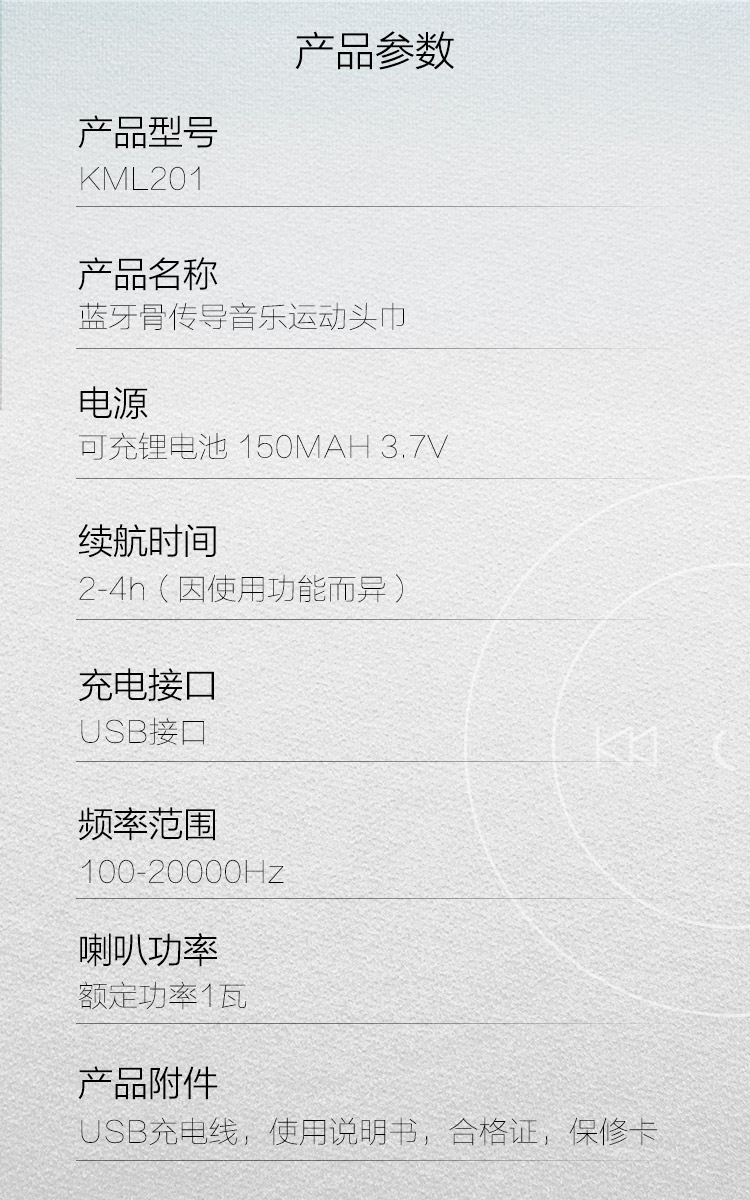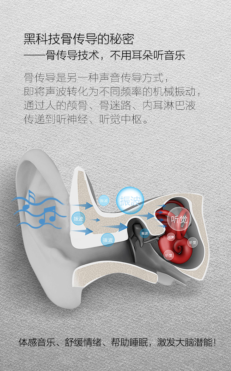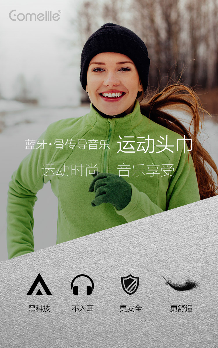 康美丽骨传导蓝牙运动头巾是采用蓝牙和骨传导技术实现播放音乐和接听电话功能的科技新品。它通过无线蓝牙与智能手机配对,配对后手机的声音会通过骨传导喇叭转化为不同频率的机械振动,进而通过人的颅骨、骨迷路、内耳淋巴液传递到听神经和听觉中枢。和普通的耳机相比,骨传导耳机具有不入耳、不损坏听力的优点;此外,基于骨传导耳机不通过鼓膜传递声音的特性,产品不会阻挡外界的声音,特别适用于户外活动。