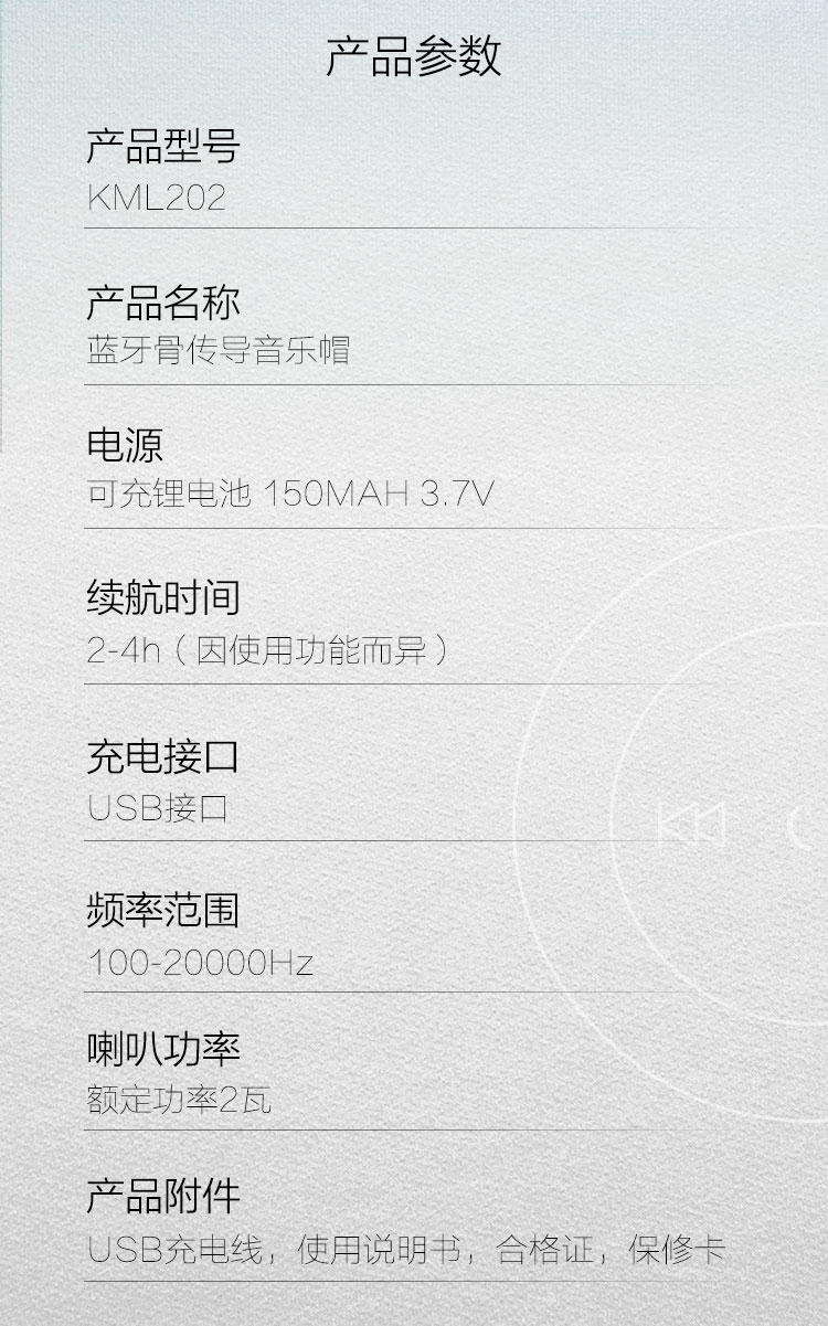 康美丽骨传导蓝牙音乐帽是采用蓝牙和骨传导技术实现播放音乐和接听电话功能的科技新品。它通过无线蓝牙与智能手机配对,配对后手机的声音会通过骨传导喇叭转化为不同频率的机械振动,进而通过人的颅骨、骨迷路、内耳淋巴液传递到听神经和听觉中枢。和普通的耳机相比,骨传导耳机具有不入耳、不损坏听力的优点;此外,基于骨传导耳机不通过鼓膜传递声音的特性,产品不会阻挡外界的声音,特别适用于户外活动。